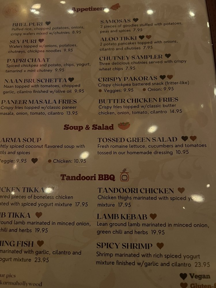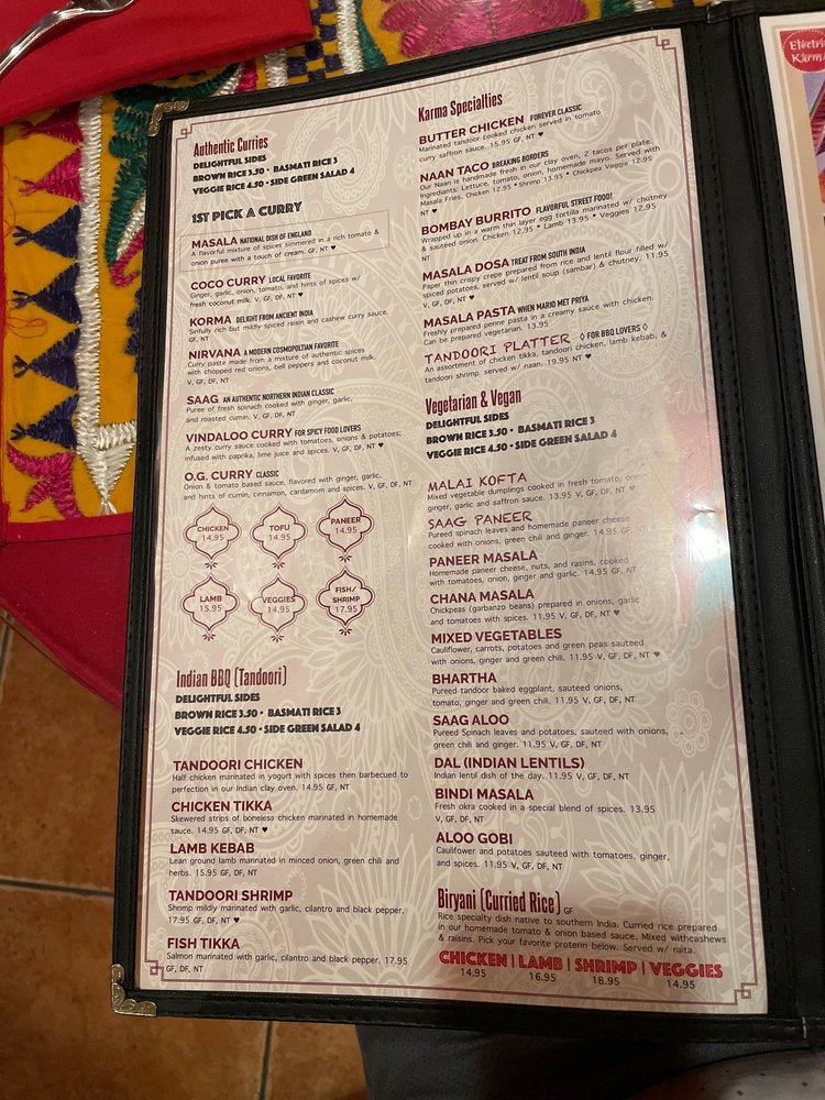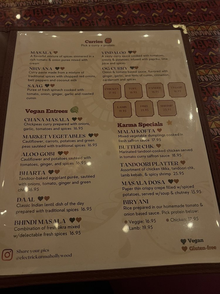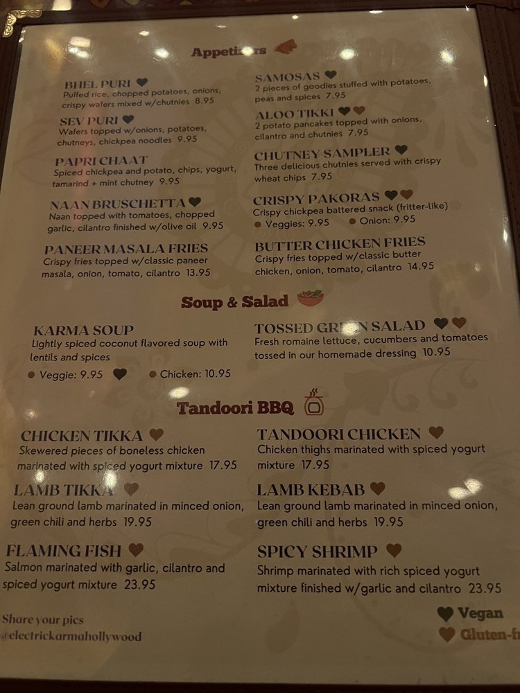 Introducing the menu at Electric Karma, a vibrant restaurant in Los Angeles offering a unique blend of Indian flavors. From traditional dishes like Chicken Tikka and Lamb Kebabs to innovative creations like Naan Bruschetta and Paneer Masala Fries, the menu caters to a variety of palates. Their range of soups and salads, including Karma Soup and Tossed Green Salad, provide refreshing options. Customers rave about the flavorful Butter Chicken, Saag, and Garlic Naan, paired with refreshing mocktail drinks like Bombay Strawberry and Mahara Mango. The restaurant's accommodating staff, cozy ambiance, and considerate service make dining here a delightful experience. With a focus on authenticity and dietary restrictions, Electric Karma is a must-visit destination for delicious Indian cuisine.
