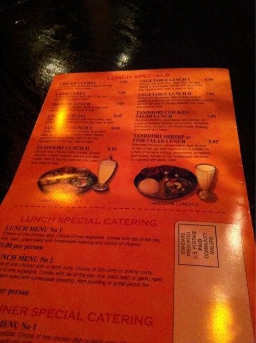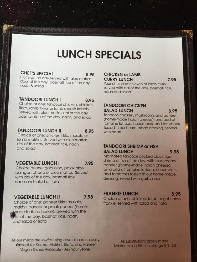 Choice of 2 appetizers, choice of 1 chicken dish or lamb curry, and choice of 2 vegetables. Comes with daal of the day, rice, plain naan, garlic naan, raita and green salad with house-made dressing. Choice of dessert.